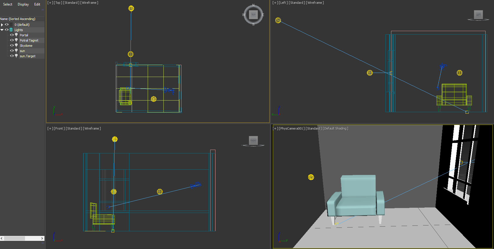 A self study of a 3-point light system within Autodesk 3Ds Max. Using the Sky Dome light mode on an exterior light to act as the "sun". Followed by a planar light to direct the light through the window space. The last light will be placed inside to control how much light is allowed to be filtered in and how intense. This creates the illusion of light falling through the window as sunlight does in reality casting hard shadows and bright light.
